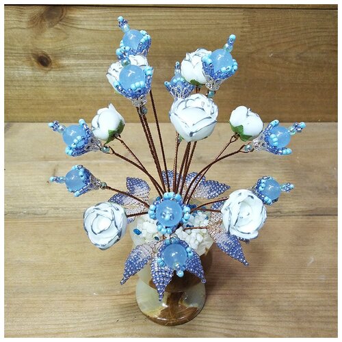Fleurs étonnantes et inhabituellement délicates de la topaze « Heavenly Love ». Le produit est fabriqué à la main. Roses en latex blanc, avec les bords des pétales surlignés en bleu. 11 pierres de topaze et feuilles perlées. La composition intérieure est complétée par un vase en onyx. Hauteur du produit 19 cm.