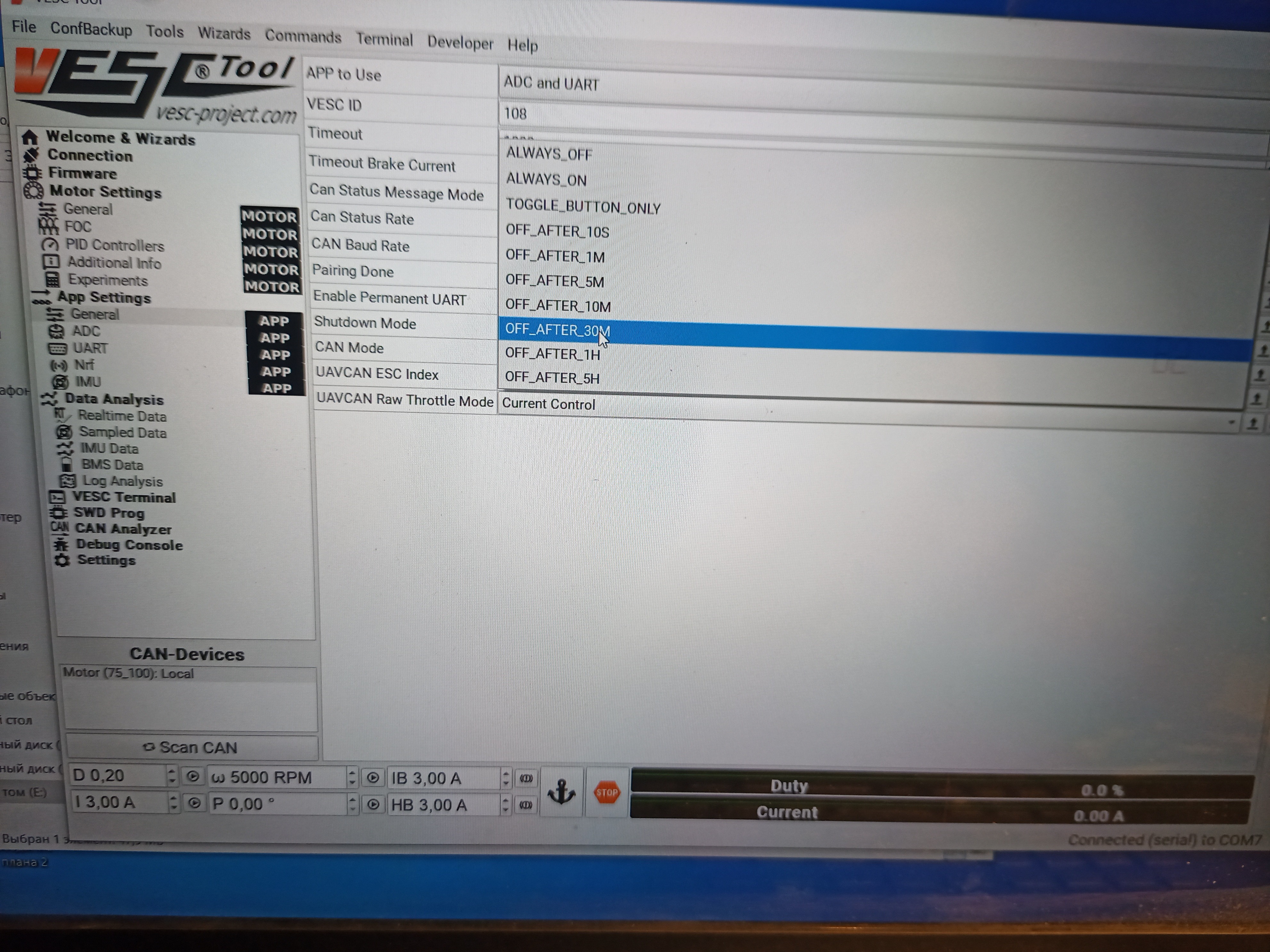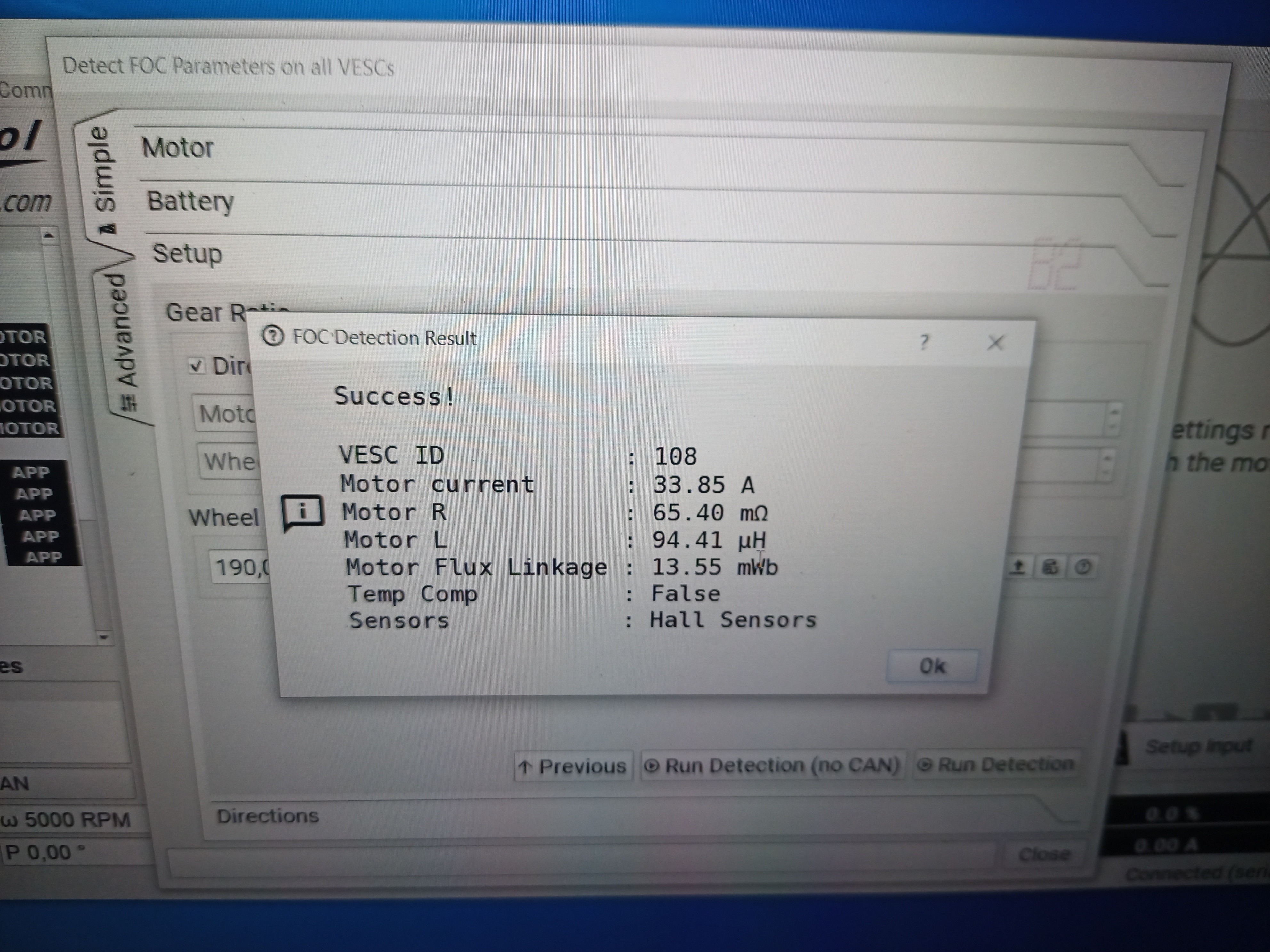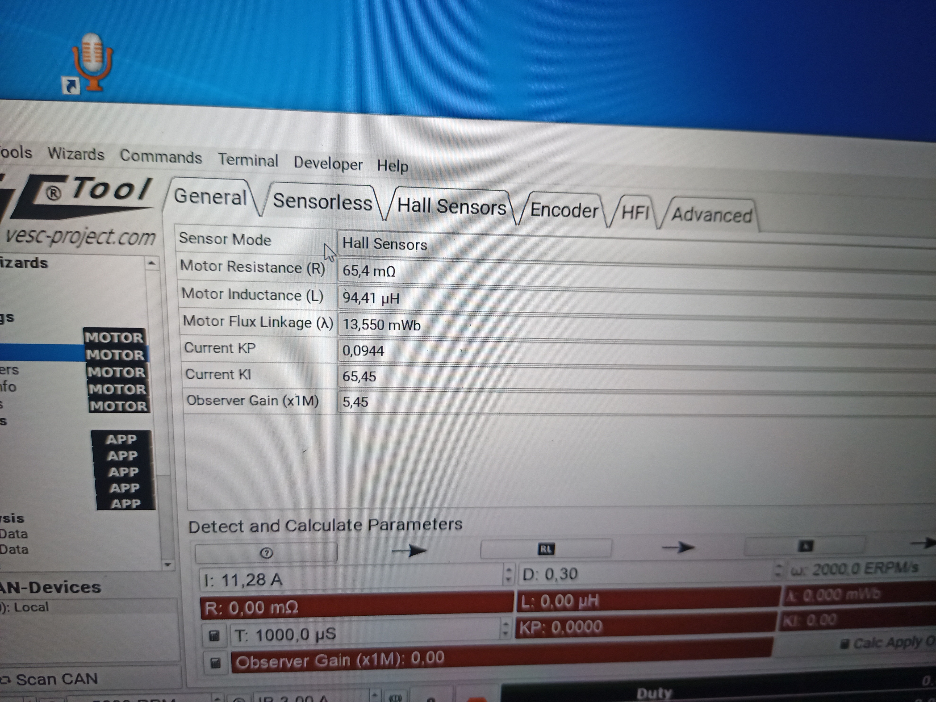 Дальше ставим vesc tools 3.0 . Первый тест и обучение мотора от мелкой куги, холлы там 120°, коммутация обмоток - распространенная звезда.