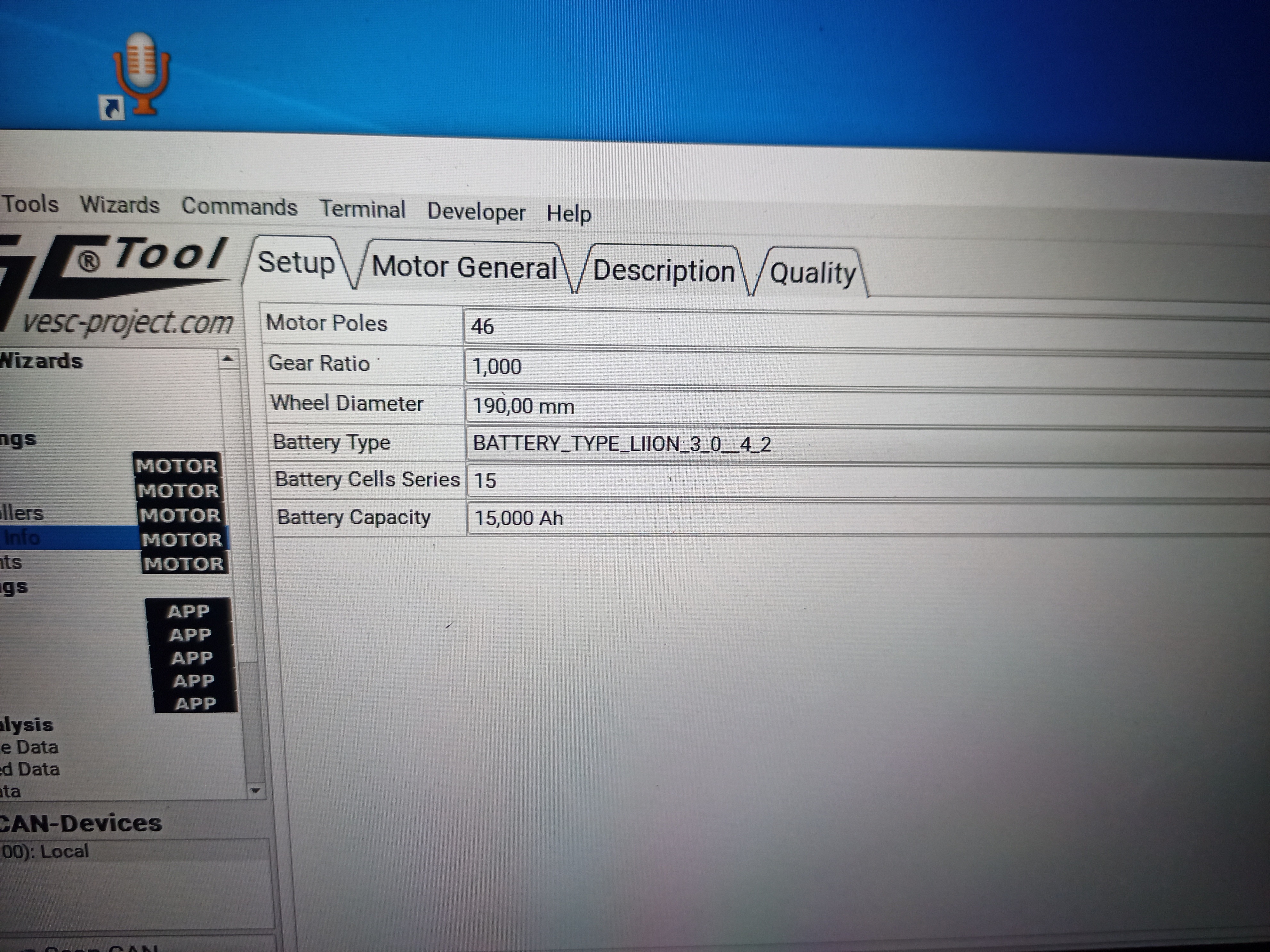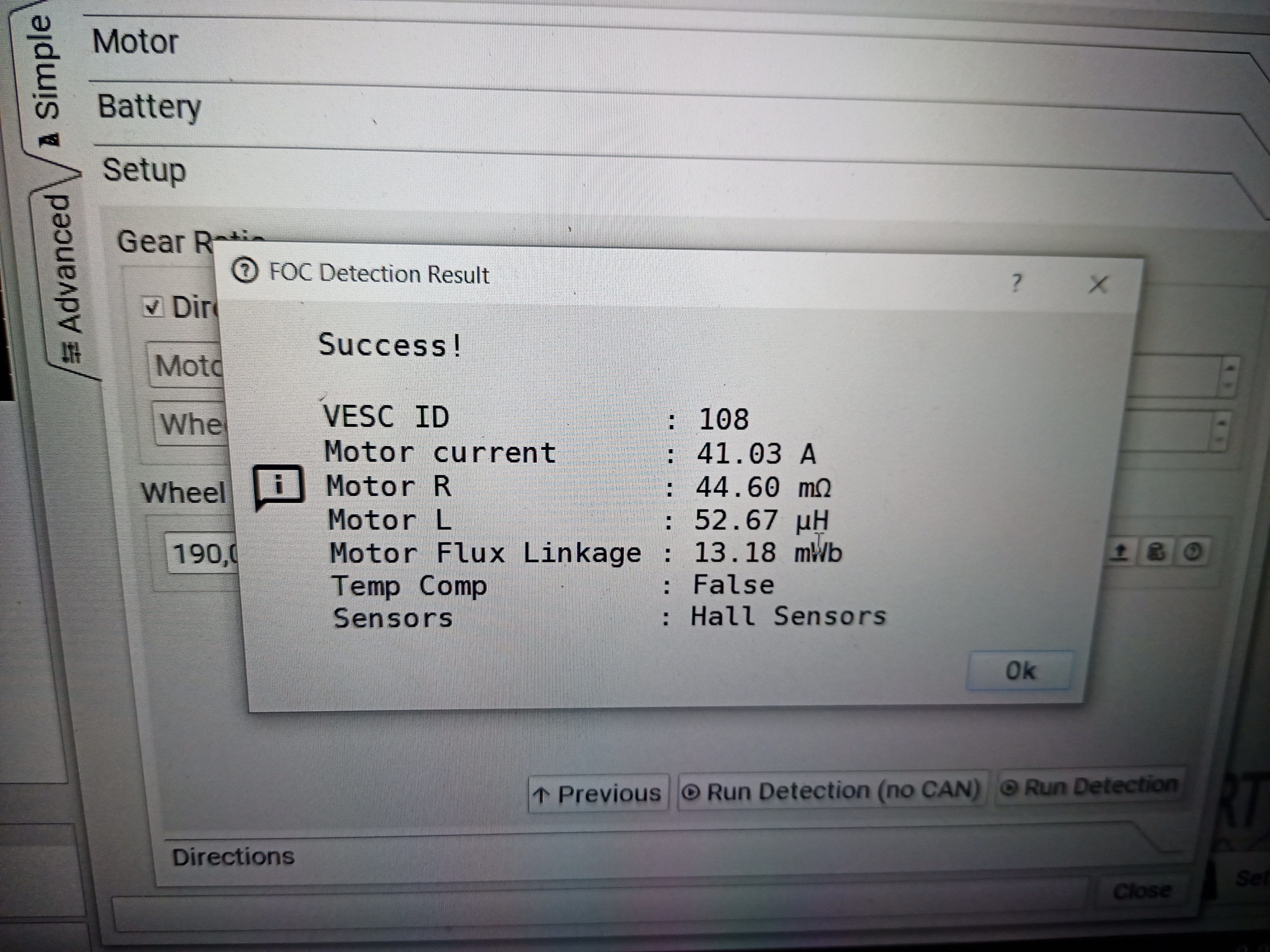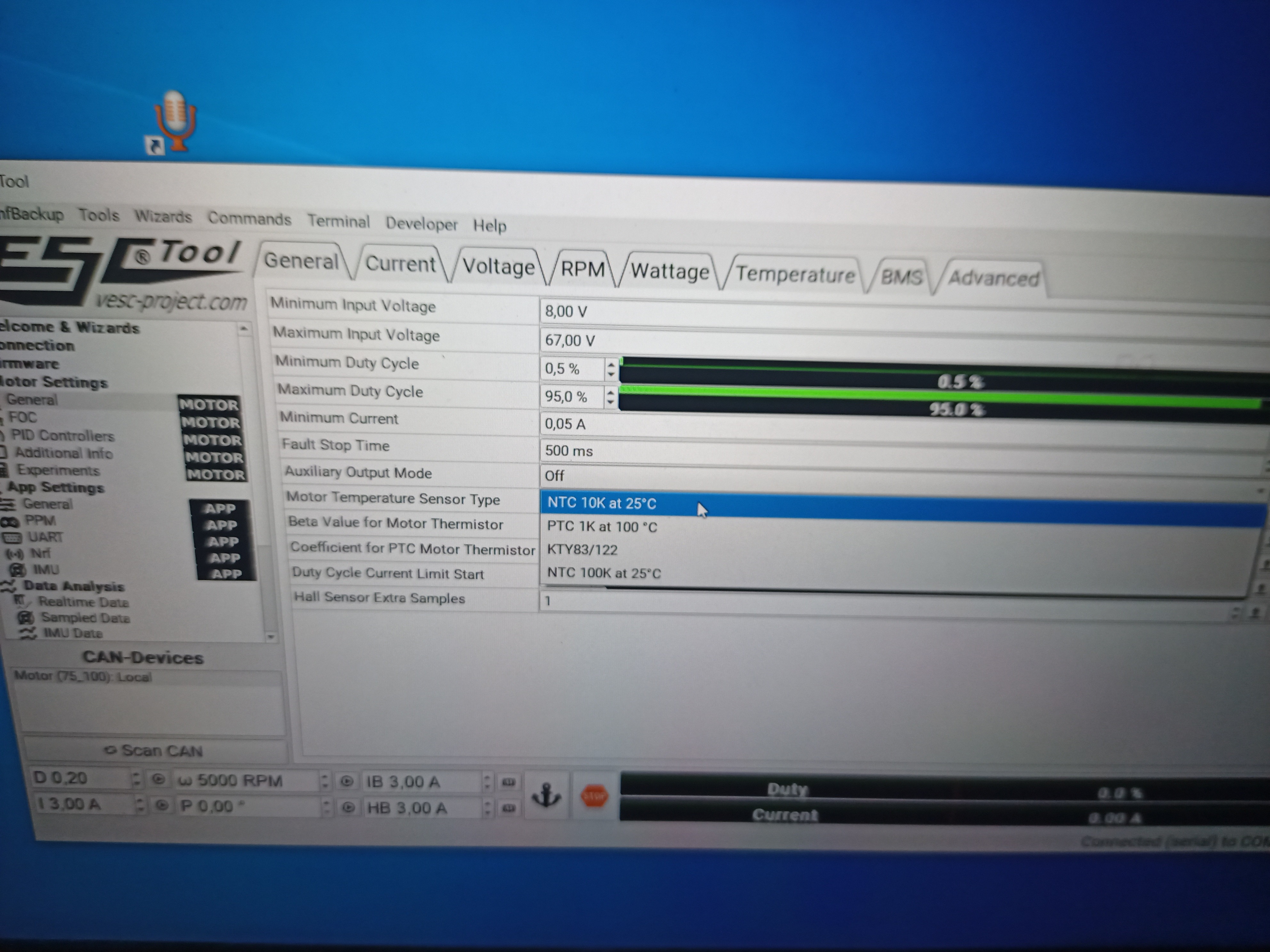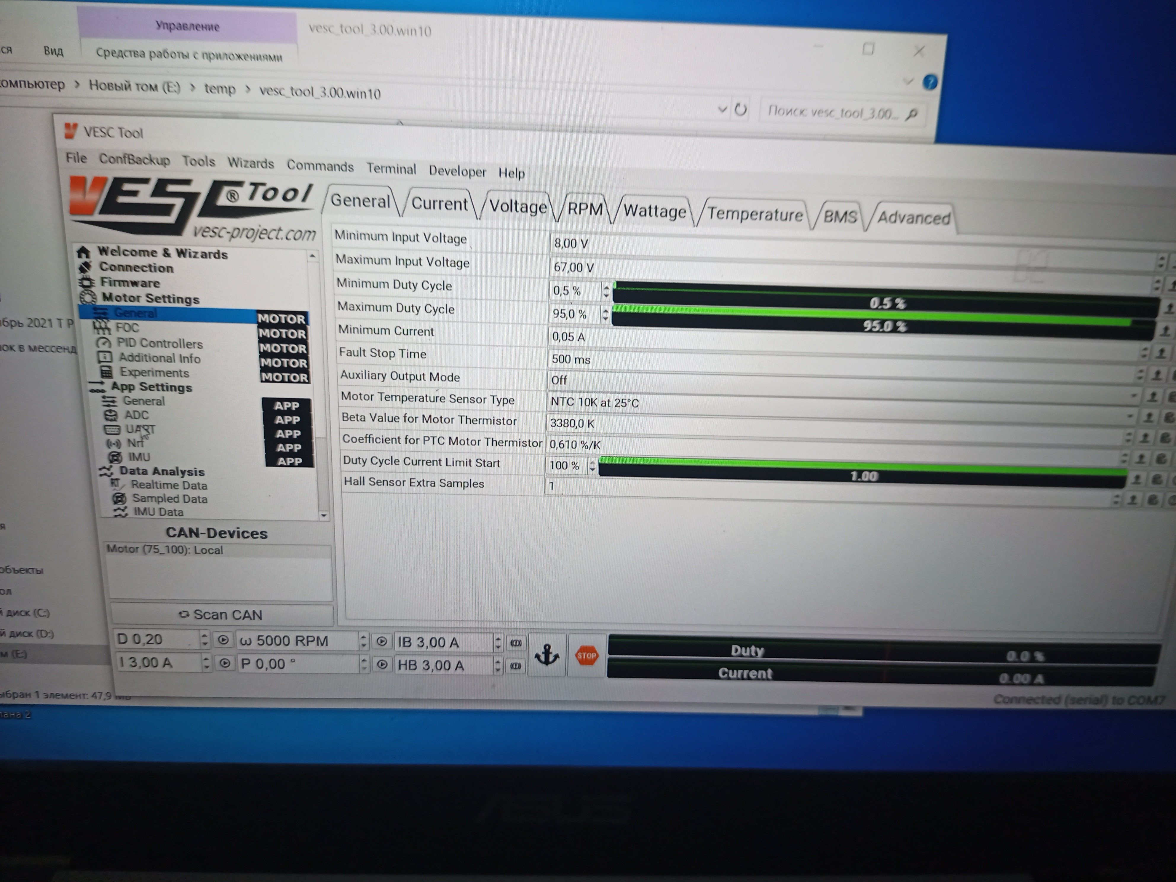 Дальше ставим vesc tools 3.0 . Первый тест и обучение мотора от мелкой куги, холлы там 120°, коммутация обмоток - распространенная звезда.