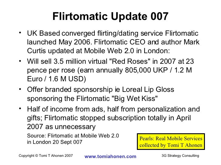 Flirtomatic . Flirtomatic was an online flirting and social networking service for people connected to the Internet via mobile phone or PC . Operated by Handmade Mobile Entertainment, Flirtomatic was named the number one mobile dating site in the U .S . in a study by the mobile measurement company Ground Truth . Flirtomatic allows members to connect . . .