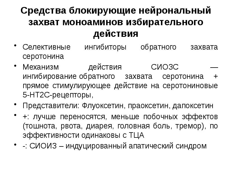Флуоксети́н ( лат . Fluoxetinum ) — антидепрессант, один из основных представителей группы селективных ингибиторов обратного захвата серотонина . Антидепрессивное действие сочетается у него с психостимулирующим . Улучшает настроение, снижает напряжённость, тревожность и чувство страха, устраняет дисфорию .