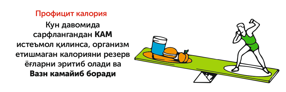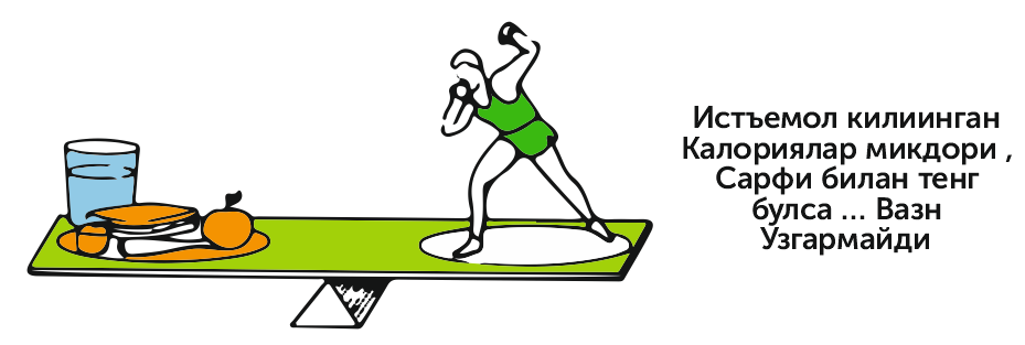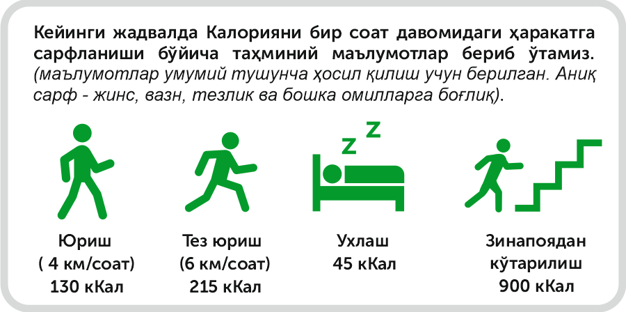 Инсон организми , кун давомида, энергия(калория) сарфлайди. Кундалик турмуш тарзимиз, ёш, вазн, бўйга қараб, хар кимда хар хил миқдорда энергия сарф бўлади.