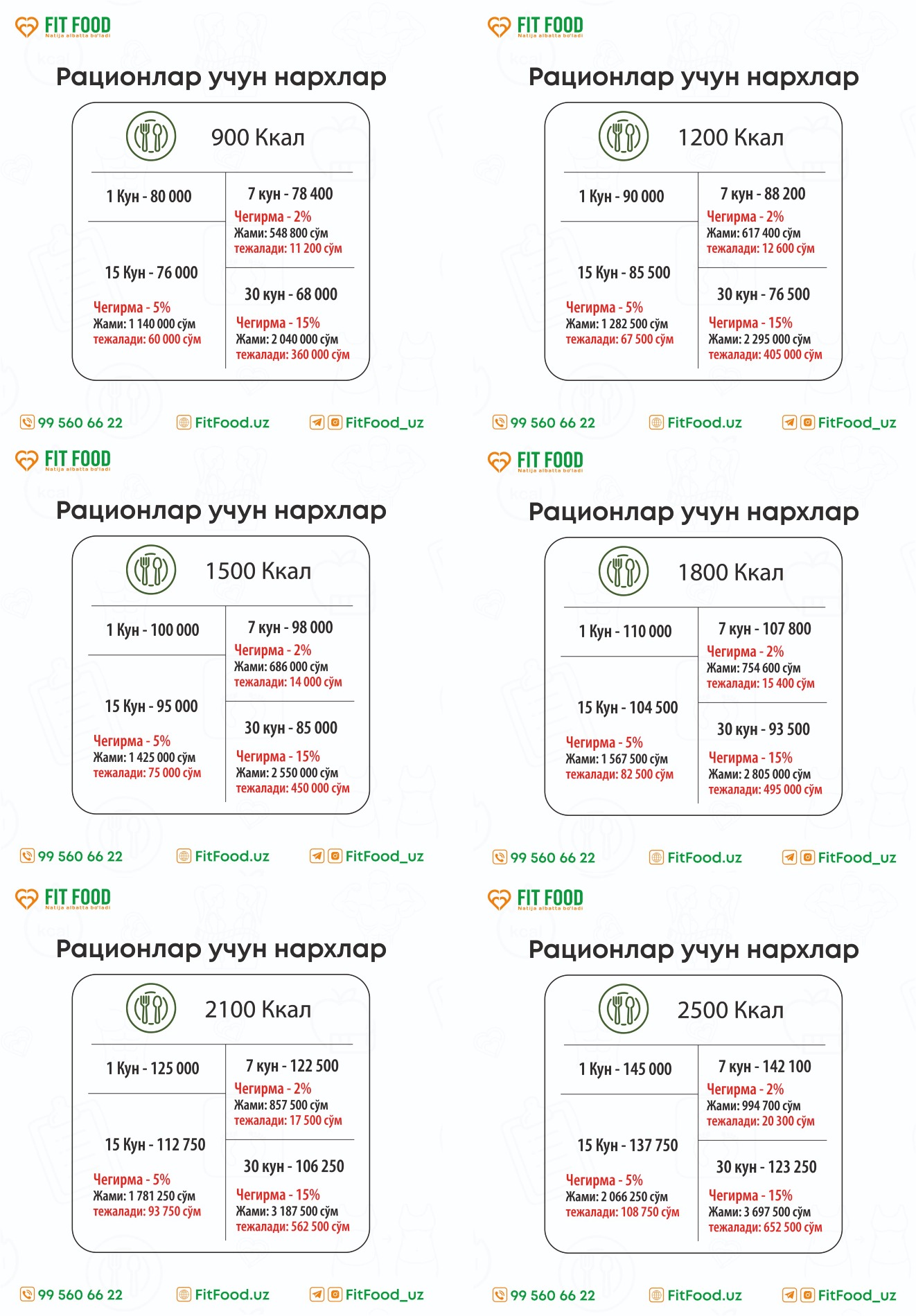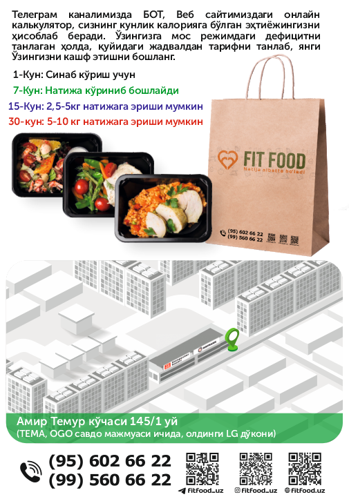 FitFOOD кундалик рациондаги овқатлари рецептлар , ушбу балансни сақлаган ҳолда ишлаб , Республикамиз етакчи овақат технологлари билан хамкорликда ишлаб чиқарилган.