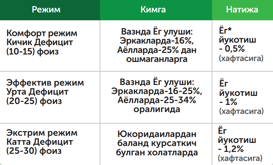 - Энергия дефицити пайтида, организм энергияни кам сарфлашга, шунингдек спорт, фитнес, юриш фаолликлари, қўшимча энергия сарфига организм кўникиб олади. Кўп овқат ейиш, фаолликни тўхтатиш, катта профицит бериб, вазн йиғилиш эффекти бошланишига йўл қўйманг.