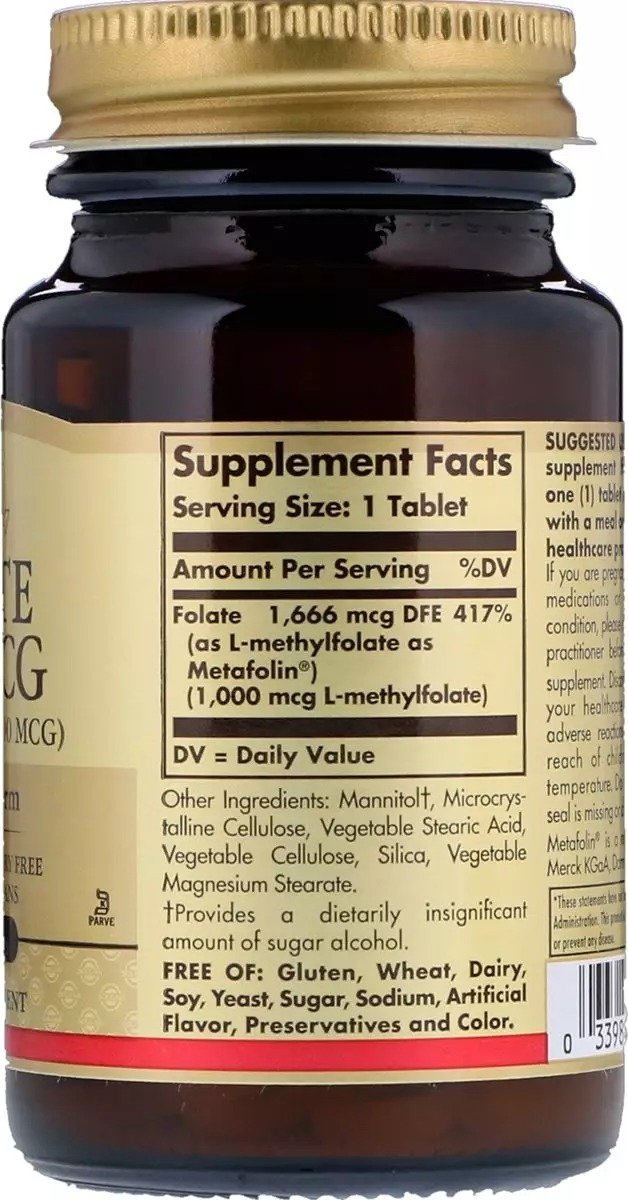 Фолат "Метафолин" Основным компонентном второго БАД Solgar является метилфолат кальция . Отвечает за формирование костей и комплексное укрепление кровеносной системы . Кальций в связке с B9 участвует в стабилизации сердцебиения, нервной системы . Метафолин подходит беременным, так как содержит двойную суточную дозу — 400 мкг .