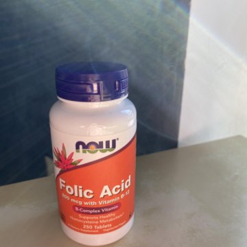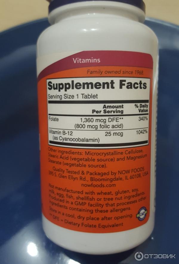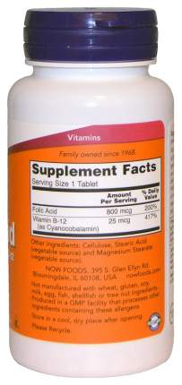 В продукте компании NOW два активных ингредиента - фолиевая кислота и кобаламин . Сочетание этих компонентов способствует выработке эритроцитов и тимидина . Форма выпуска Таблетки по 250 штук в упаковке . Состав В одной таблетке содержится 800 мкг фолиевой кислоты и 25 мкг цианокобаламина .
