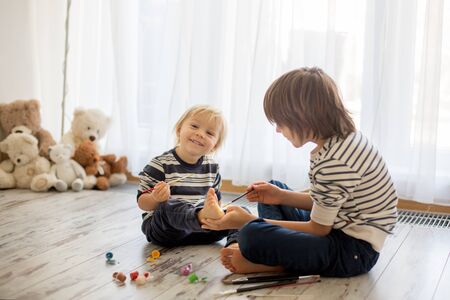 Young artist "Art teacher painting a boy's foot with pink paint . Being tickling, young boy making a funny face . Concepts: learning; art; childhood; cheerful, painting . Snapshot, selective focus ." tickling kids feet stock pictures, royalty-free photos & images