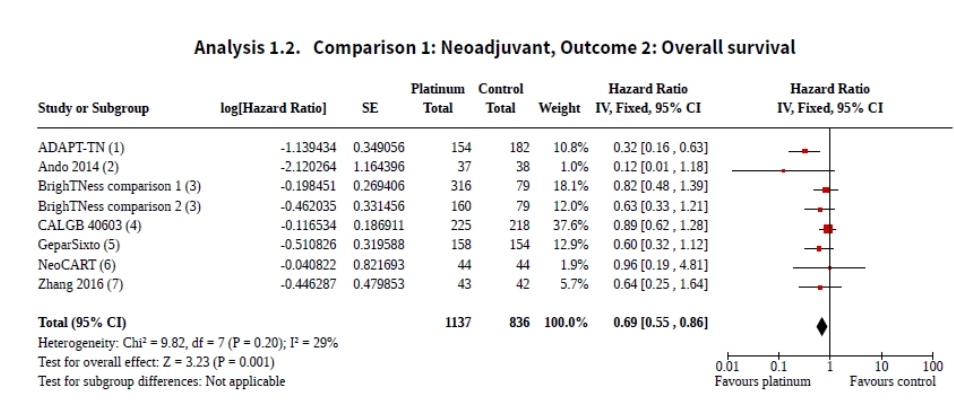 Заключительная, итоговая оценка представлена в виде ромба внизу графика. На данном графике края ромба не пересекают осевую линию (референс для HR = 1), соответственно, если не докапываться, а просто дать общую оценку результата мета-анализа, можно сказать о том, что платина в неоадъюванте при раннем ТНРМЖ увеличивает общую выживаемость.