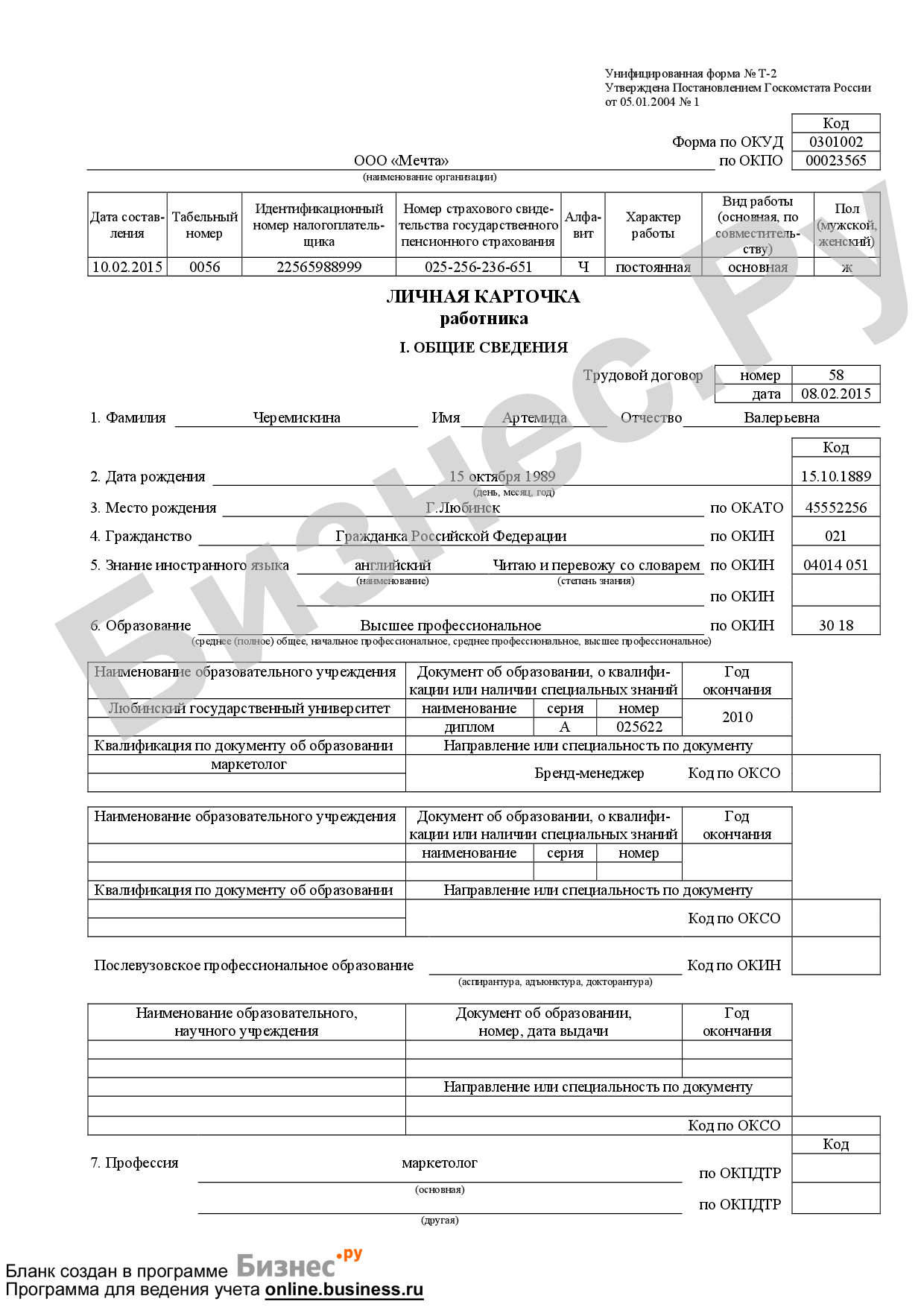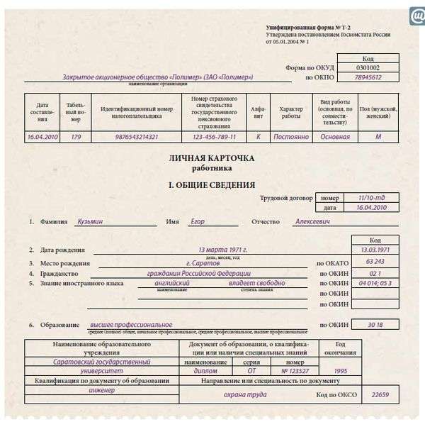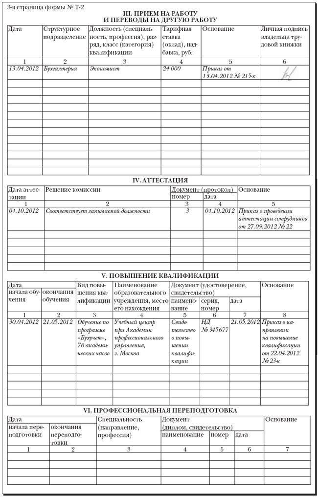 Форма т2 заполнение