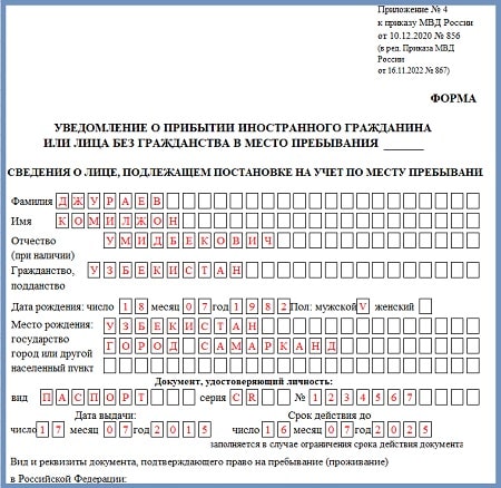 Форма уведомления о приеме иностранца