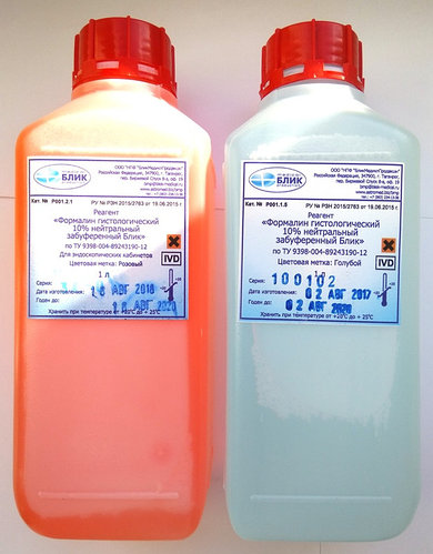 1л - 121,70 руб . 5л - 578,20 руб . Раствор формалина 10% нейтральный, забуференный (по Лилли) . Массовая доля формальдегида 3,7 % . Прозрачная бесцветная жидкость своеобразного острого запаха . Смешивается во всех соотношениях с водой и этиловым спиртом, 96 % .