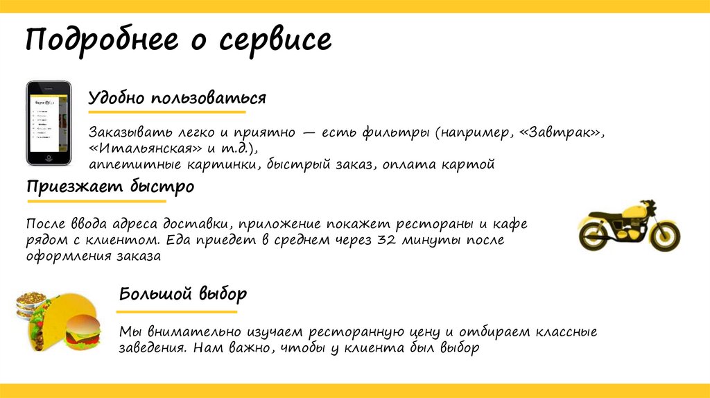 Яндекс .Еда — это сервис для заказа готовой еды из любимых кафе и ресторанов: от бургеров до суши, от борща до мороженого . Найдётся и пицца, и роллы, воки, бургеры, club сэндвичи, грузинская кухня .