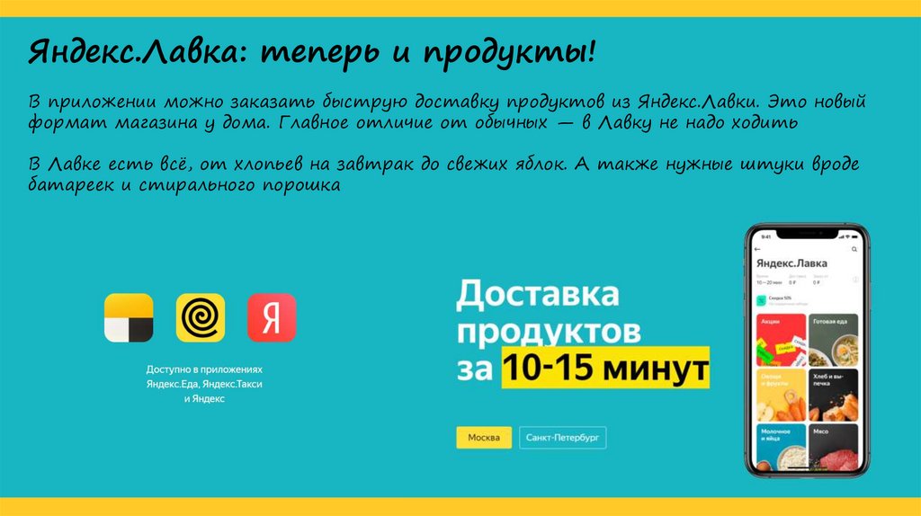 Яндекс .Лавка: заказ продуктов . Быстрая доставка продуктов, готовой еды и товаров для дома . Яндекс .Лавка — новый формат магазина у дома . Главное отличие, что в него не нужно ходить: продукты . . .