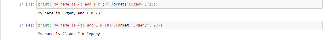 Как мы видим, по умолчанию каждый заполнитель идет по порядку от 0 и так далее. Соответственно, мы можем изменять порядок заполнения плейсхолдеров путем написания в фигурных скобках порядкового номера агрумента из функции .format.