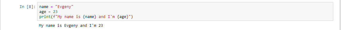 Так же есть более сокращенный вид форматирования строк, и кстати такое форматирование строк называется интерполяцией. То есть мы можем опустить функцию .format и использовать переменные напрямую в строке: