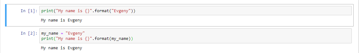 Placeholder обозначается, как фигурные скобки, через .format мы объявляем, что должно быть в этом заполнителе. Мы можем использовать как текст, так и переменную, как во втором примере.