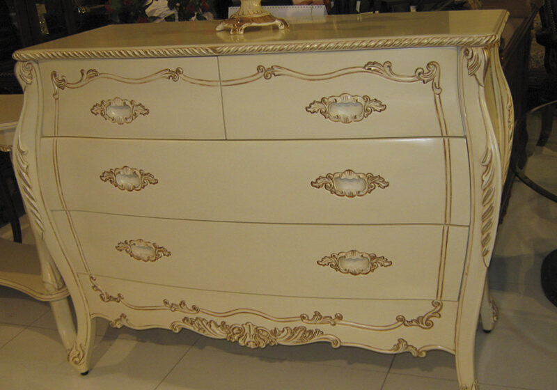 Оригинальный комод «Катрин 92.19» входит в коллекцию мебели для спальни «Катрин». Ажурная декоративная накладка окрашена вручную. Фасады ящиков украшены оригинальной фрезеровкой.