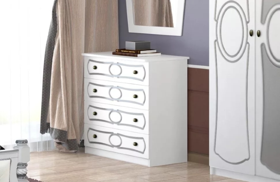 Дизайнерский 3D-рисунок делает комод нежным и изысканным. В комоде установлены четыре выдвижных ящика. Дверцы комода оснащены петлями с доводчиками для плавного закрывания.