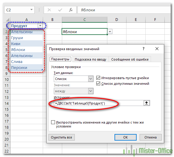 Формула эксель выпадающий список