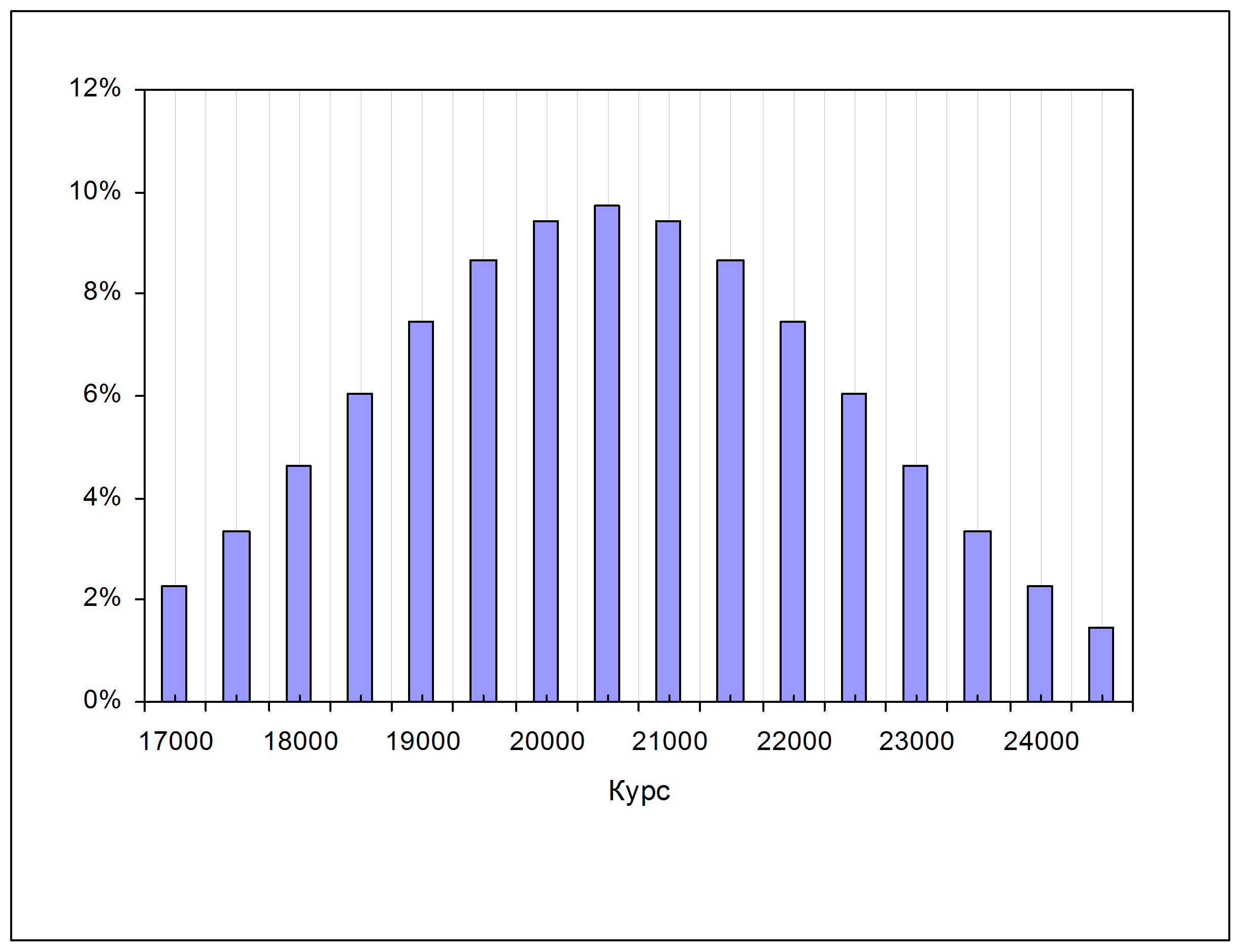 Видно, что вероятность значительного уклонения цены от «центра», определяемого текущим положением рыночной цены, резко уменьшается по мере удаления от этого центра.