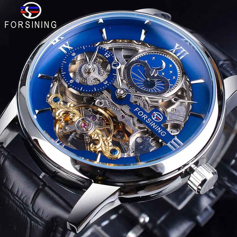 "Forsining Dual Time Zone Automatic Skeleton Watch Blue Dial Leather Band Waterproof Mechanical Watch Moon Phase Men Sport Clock" * Buy Now Just For 40$