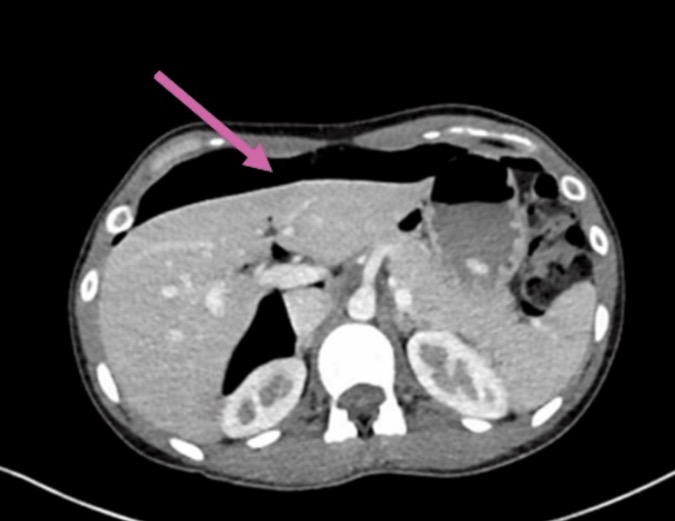 Фото 1НемедицинаFigure 1. Компьютерная томография, демонстрирующая пневмоперитонеум; воздух отмечен розовой стрелкой.Немедицина