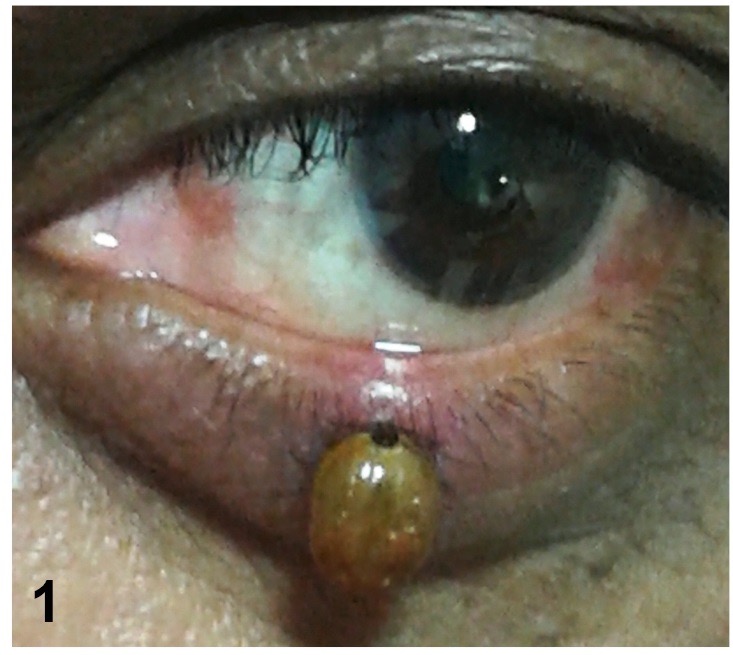 Figure 1. Коричневый собачий клещ, прикрепившийся к нижнему веку.