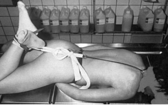 НемедицинаFigure 2. 28-летняя женщина, связанная цепями, лежит в комнате. Характер фиксации цепей хорошо виден, демонстрируя сходство с типичным ритуалом убийства итальянской мафии, называемым “инкапреттаменто”.