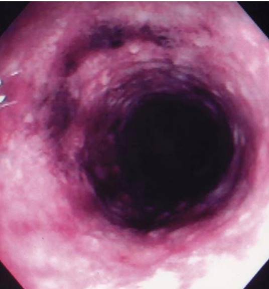 Эндоскопический вид слизистой оболочки сигмовидной кишки через 1 день после введения спиртовой клизмы, показывает слизистую оболочку от пурпурного до чёрного цвета и потерю сосудистого рисунка.