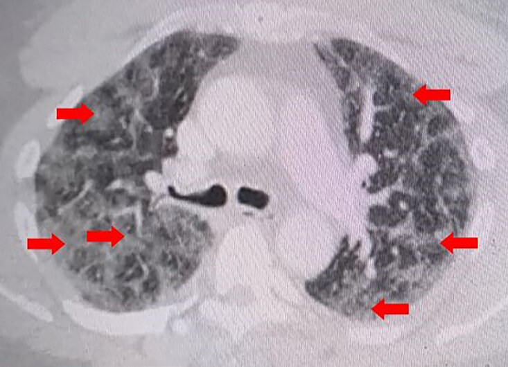 Figure 3. Компьютерная томографическая ангиография грудной клетки с внутривенным контрастированием в поперечном разрезе демонстрирует умеренное, рассеянное, диффузное воспаление легких и интерстициальные образования в легких без тромбоэмболии легочной артерии, как показано красными стрелками. Также имеются незначительные подкожные растяжения и эмфизема передней грудной стенки.