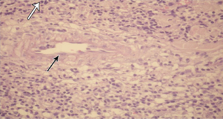 НемедицинаИзъязвленная область, богатая лимфоцитами и плазматическими клетками, с воспалением, сосудистой пролиферацией и набуханием эндотелиальных клеток в сосудистых структурах (окрашивание гематоксилин-эозином; увеличение в 20 раз. Плазматические клетки (белая стрелка), набухание эндотелиальных клеток в сосудистых структурах (черная стрелка).