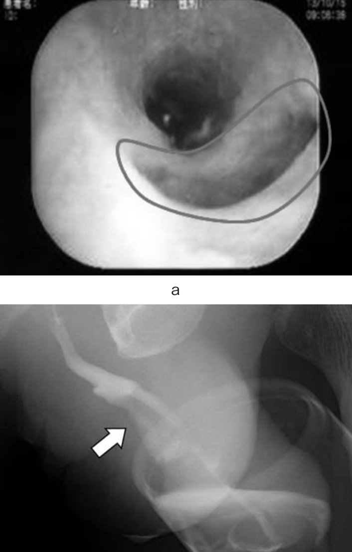 а: Уретроскопия показала кожно-уретральный свищ в передней части мочеиспускательного канала (круг).