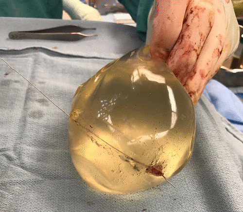 Фото 5НемедицинаFigure 5. Интраоперационный вид имплантата левой груди, показывающий траекторию полета пули через имплантат.Немедицина