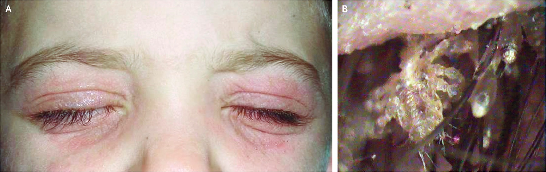 Эритема век (фото А) и лобковые вши с гнидами на ресницах (фото B)