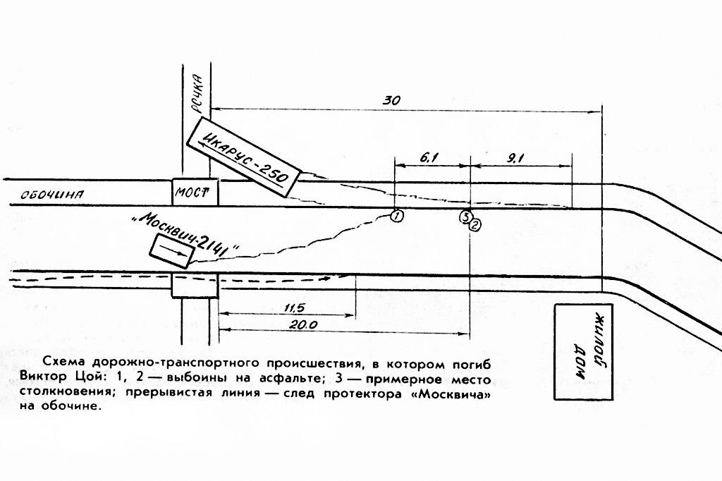 Смотреть все фото в галерее . Авария произошла примерно в 11:30 при ясной погоде и Виктор Цой был за рулем «Москвича», автобусом управлял профессиональный водитель Янис Фибикс . Мы видим его на схеме ДТП, которую по фотографии того времени восстановили . . .