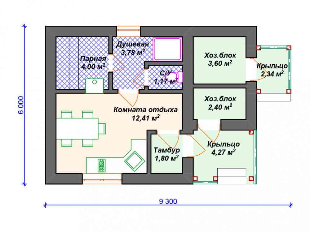 Баня 6х9 одноэтажная с террасой, проект бани размером 6 на 9