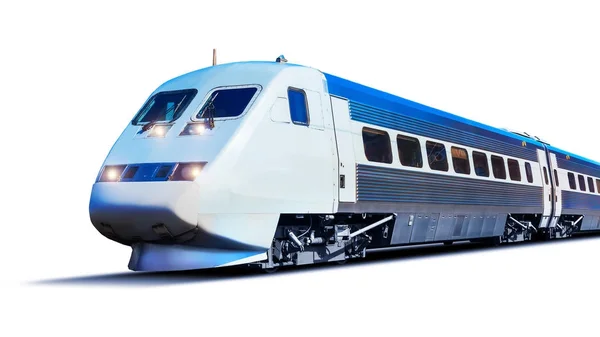 MikhailLeonov Удивительно красивый впечатляющий вид спереди на движущийся белый красно-синий красивый скоростной пассажирский поезд . Движение размыто . Московские скоростные поезда железнодорожные пути .