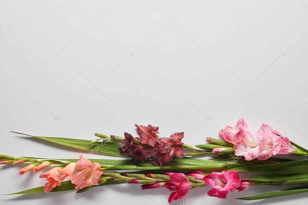 Цветы фон . Пограничная рамка из розовых и желтых гладиолусов на белом фоне . Образец гладиол, праздничная открытка . Квартира лежала, вид сверху . Цветы фон . Рамка из цветов .