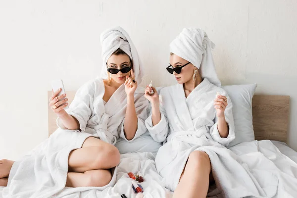 Vadymvdrobot Размытое фото счастливых улыбающихся женщин 20 лет в белом халате, лежащих дома в роскошной спальне и делающих селфи на смартфоне во время девичника