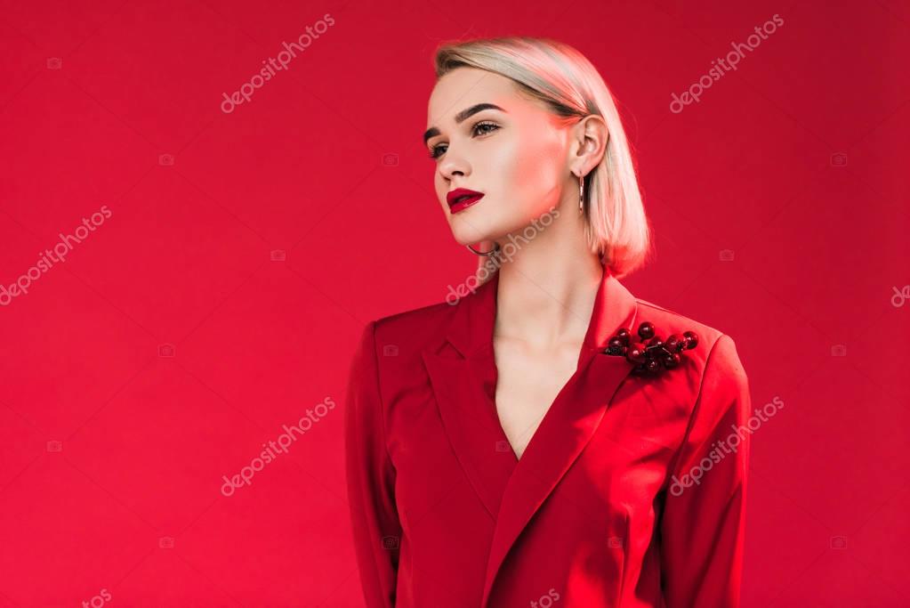 Девушка в пиджаке: cтоковые фото, картинки, . . . Привлекательная модель в красном костюме в смокинге позирует в студии с пиджаком на плечах .