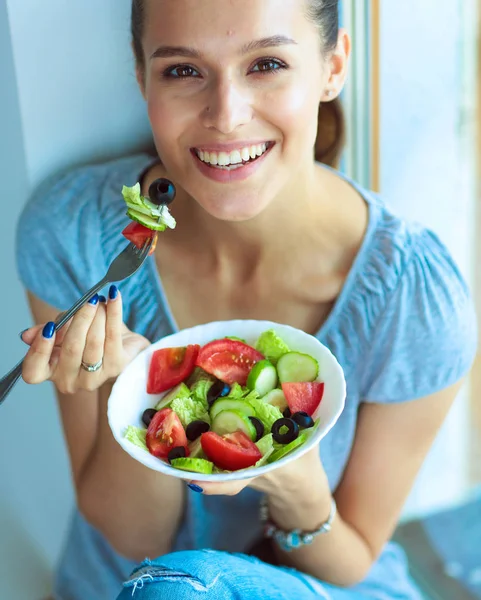 Девушка держит вилку с сочным спелым помидором . Соблазнительная девушка ест красный овощ . Женщина, полная желания есть помидоры . Девушка обожает спелые помидоры .