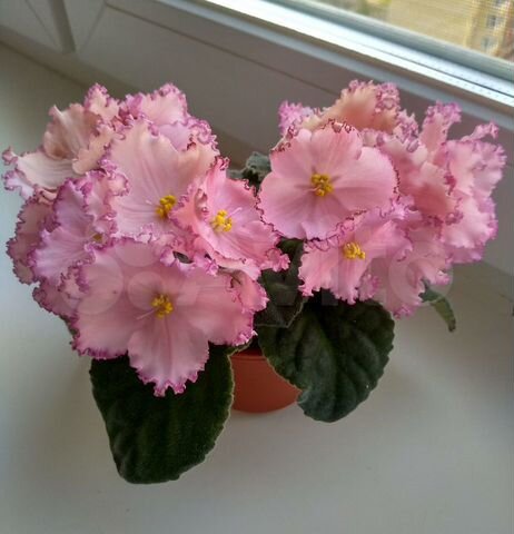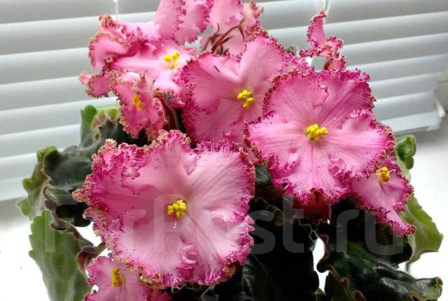 Отечественные фиалки РМ-Принцесса Турандот Очень крупные розовые диски с гофрированной рюшей и с малиновым напылением .
