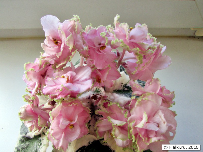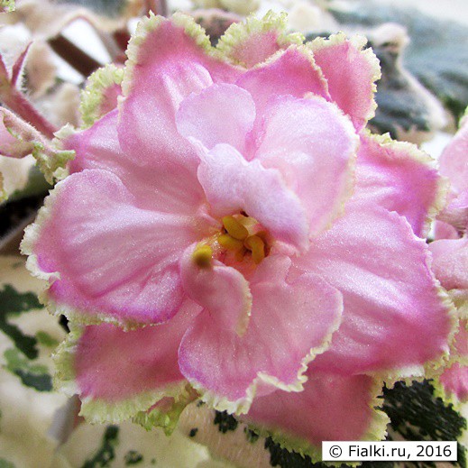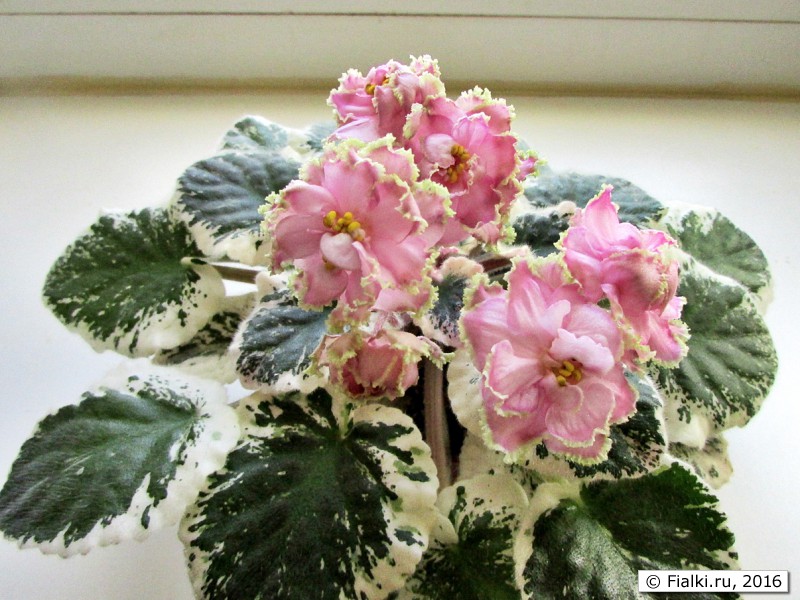 Фиалка РС-Золотая Рыбка, С .Репкина Простые и полумахровые светло-розовые звезды с затемнениями к краю лепестков с широкой золотистой бахромкой очень нарядны на фоне красивой зелено-бело-розовой листвы .