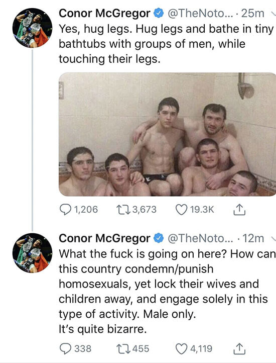 Она нужна ему, как обделавшемуся 10 раз подряд», — написал Макгрегор в «Твиттере», приложив знаменитое фото Хабиба в автобусе, который в 2017 году атаковала команда Макгрегора .