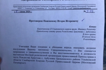 Священника храма в селе Арбузовка Ульяновской области, протоиерея Игоря Пашменова, освободили от . . .