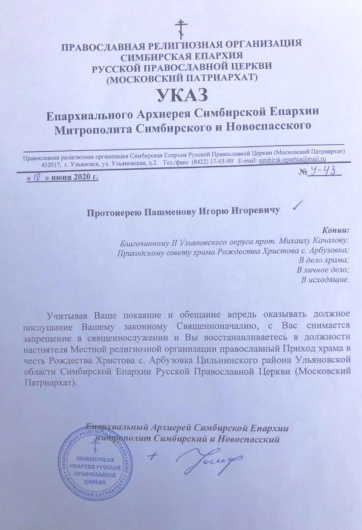 Митрополит Симбирский и Новоспасский Иосиф указом от 11 июня освободил от должности настоятеля храма в честь Рождества Христова села Арбузовка Цильнинского района протоиерея Игоря Пашменова .