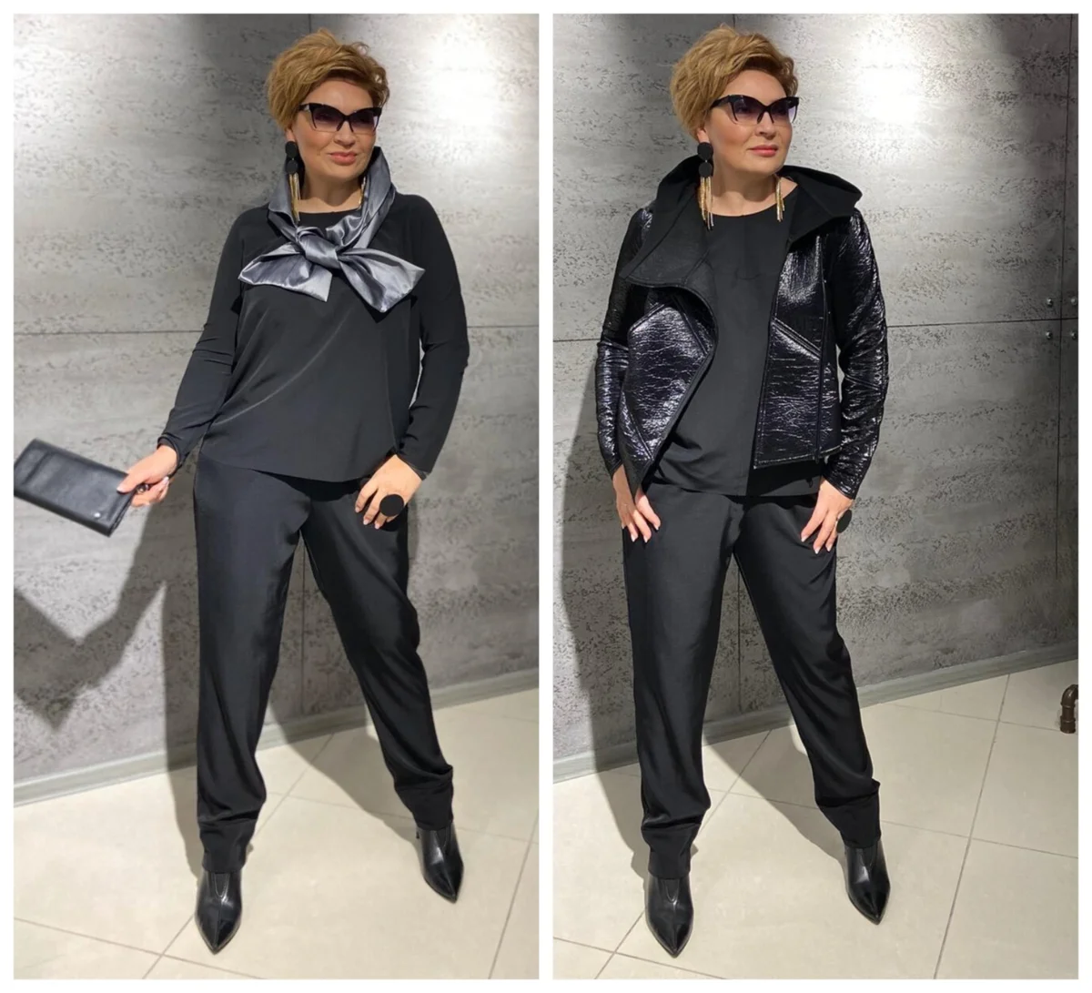 Фото 6, 7 — стилист Ирина Конарева . Образ всё тот же, но стилист показывает, как чёрную одежду можно украсить разными аксессуарами и освежить лицо при помощи шёлковой косынки .