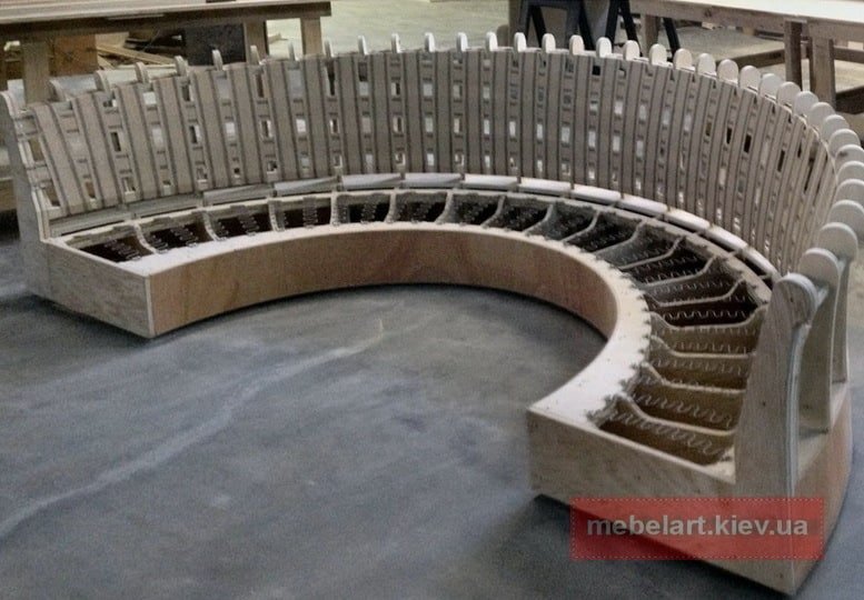 Чаще всего для изготовления круглых диванов используются металлические стальные каркасы, на которых зафиксированы ламели из дерева .