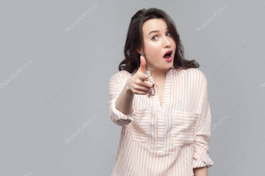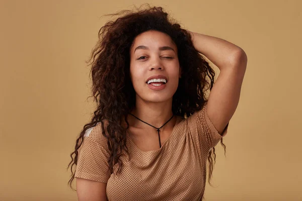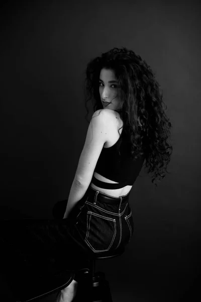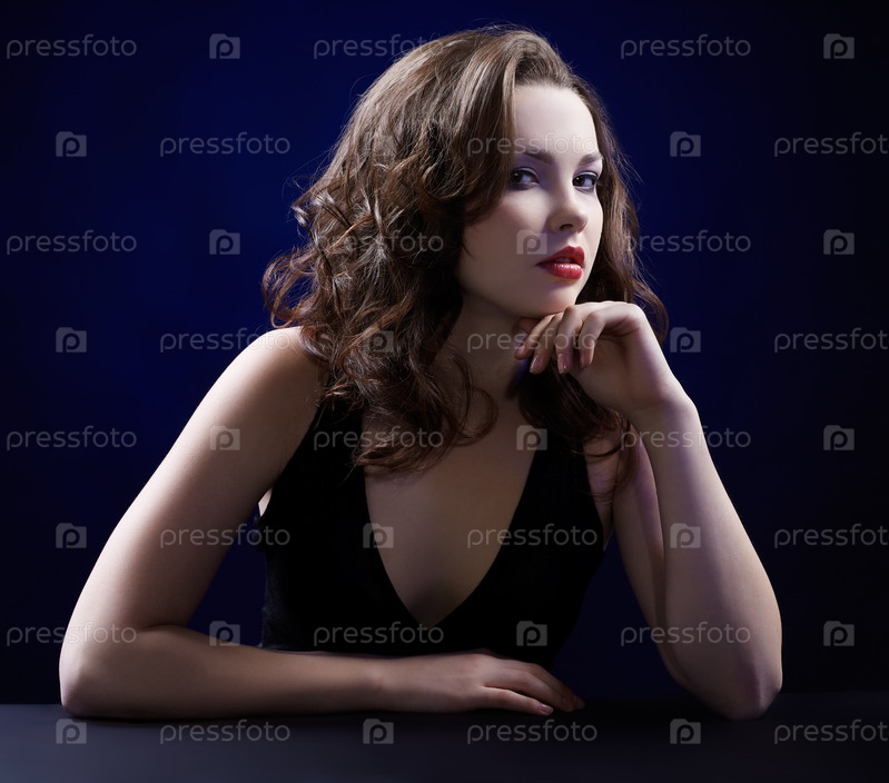 Суровая молодая кареглазая кудрявая брюнетка с темной . . .