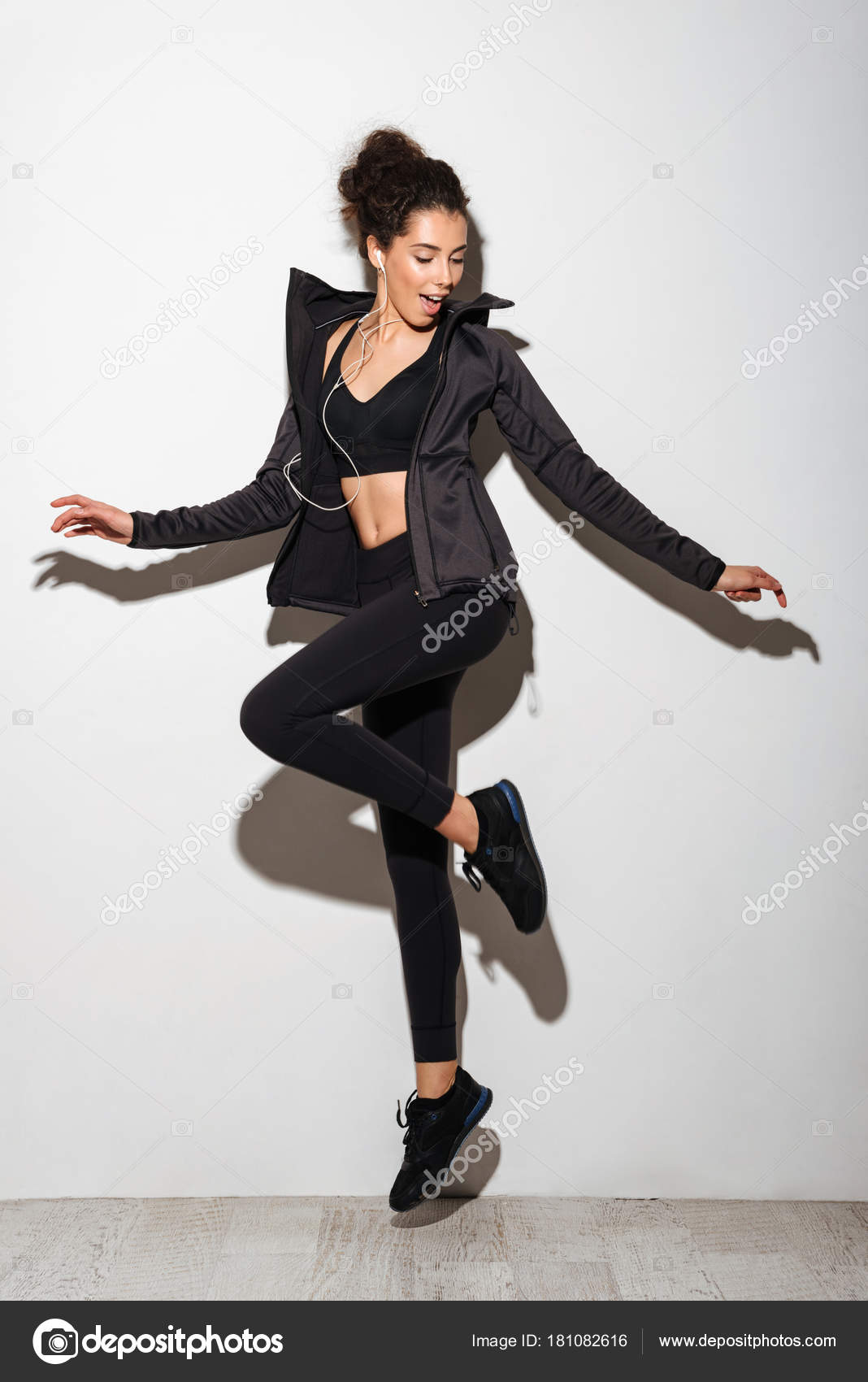 Студийное фото молодой довольно темноволосой кудрявой брюнетки с естественным макияжем, спокойно смотрящей в камеру и держащей руки вниз, позируя на белом фоне . nakaridore